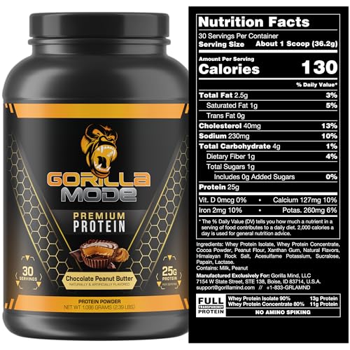Gorilla Mode Premium Whey Protein – Chocolate Peanut Butter / 25 Grams of Whey Protein Isolate & Concentrate/Recover and Build Muscle (30 Servings)